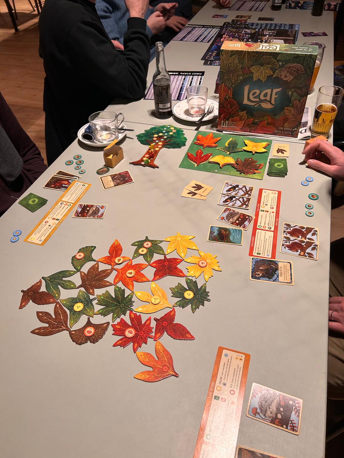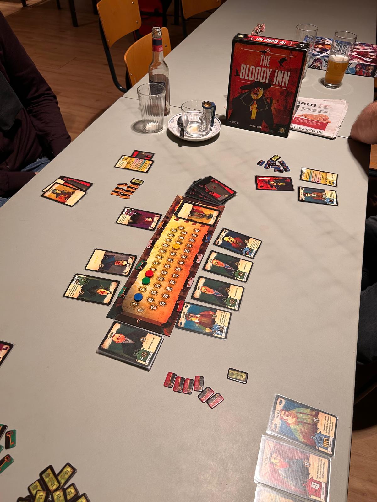 Aan de tweede tafel dacht Alexandre er gelukkig wél aan om foto's te nemen (waarvoor we anders ook altijd op Alain kunnen rekenen) en kwam Leaf op tafel, een herfstig spel dat mooi aansluit bij het slechte weer buiten. Na afloop van beide spellen bleven we nog met vijf spelers en tijd genoeg over voor een extra spel. We kozen voor The Bloody Inn, een spel waarin je als herbergiers zo rijk mogelijk probeert te worden door af en toe één van je gasten ongemerkt te vermoorden en begraven. Een luguber thema, dat blijkbaar gebaseerd is op het waargebeurde verhaal (of de legenda?) van de 'Auberge Rouge van Peyrebeille'.